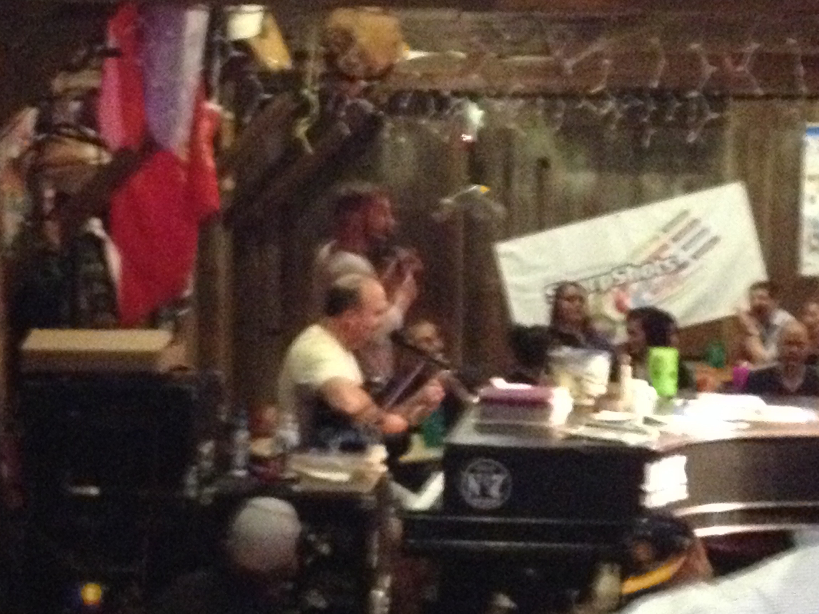 I’m happy to say that work went off without a hitch. It was a quiet day at the store and I even managed to finish the project I was given. At 8 o’clock I handed the keys off to the replacement crew and headed out the door. I got home and picked up Chrysa at 8:20 or so. She was dressed and ready to go. She looked really pretty in her bohemian club wear. I decided on a black button down with a red velvet vest and jeans.  We were out the door.